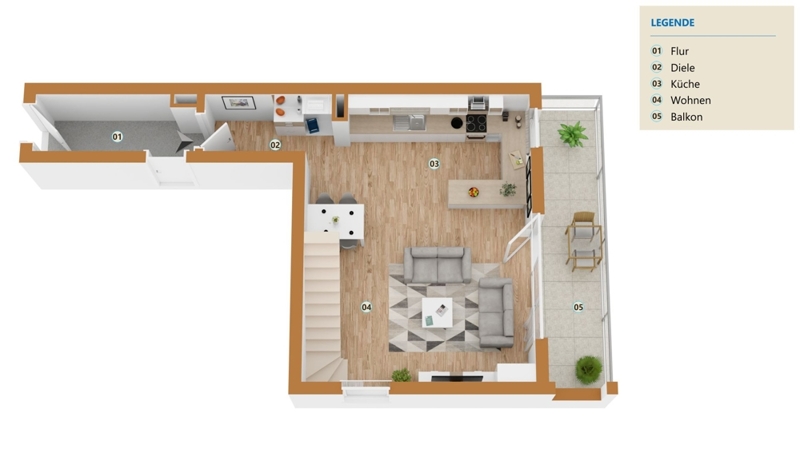 Eine Markenküche mit Miele-Elektrogeräte ist ebenfalls im Preis enthalten. Die Fußbodenheizung im großzügigen Wohnzimmer und im Tageslichtbad geben besondere Wärme. Ein Extra WC ist neben der BadToilette auch vorhanden.
